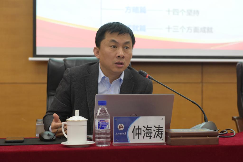 开班式结束后,仲海涛以《学习贯彻习近平新时代中国特色社会主义思想 为奋进新征程凝心铸魂》为题作专题辅导,紧紧围绕开展学习贯彻习近平新时代中国特色社会主义思想主题教育的重要意义、总要求、根本任务进行分析讲解,报告深入浅出、旁征博引、案例详实、针对性强,对全校党员干部深刻学习领会习近平新时代中国特色社会主义思想、开展好主题教育的理论学习具有很强的指导作用。