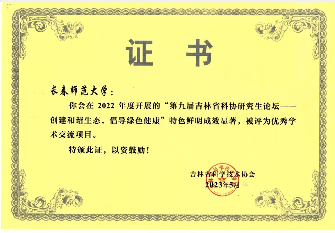 近日,在吉林省科协2022年度吉林省科协学会学术工作评优表彰中,我校科学技术协会荣获“2022年度学术工作先进集体”称号,由我校承担的“第九届吉林省科协研究生论坛——创建和谐生态,倡导绿色健康”项目荣获“2022年度优秀学术交流项目”,曹威获“2022年度优秀学术交流活动组织者”称号。