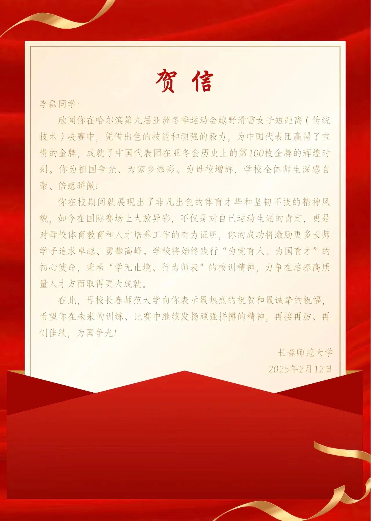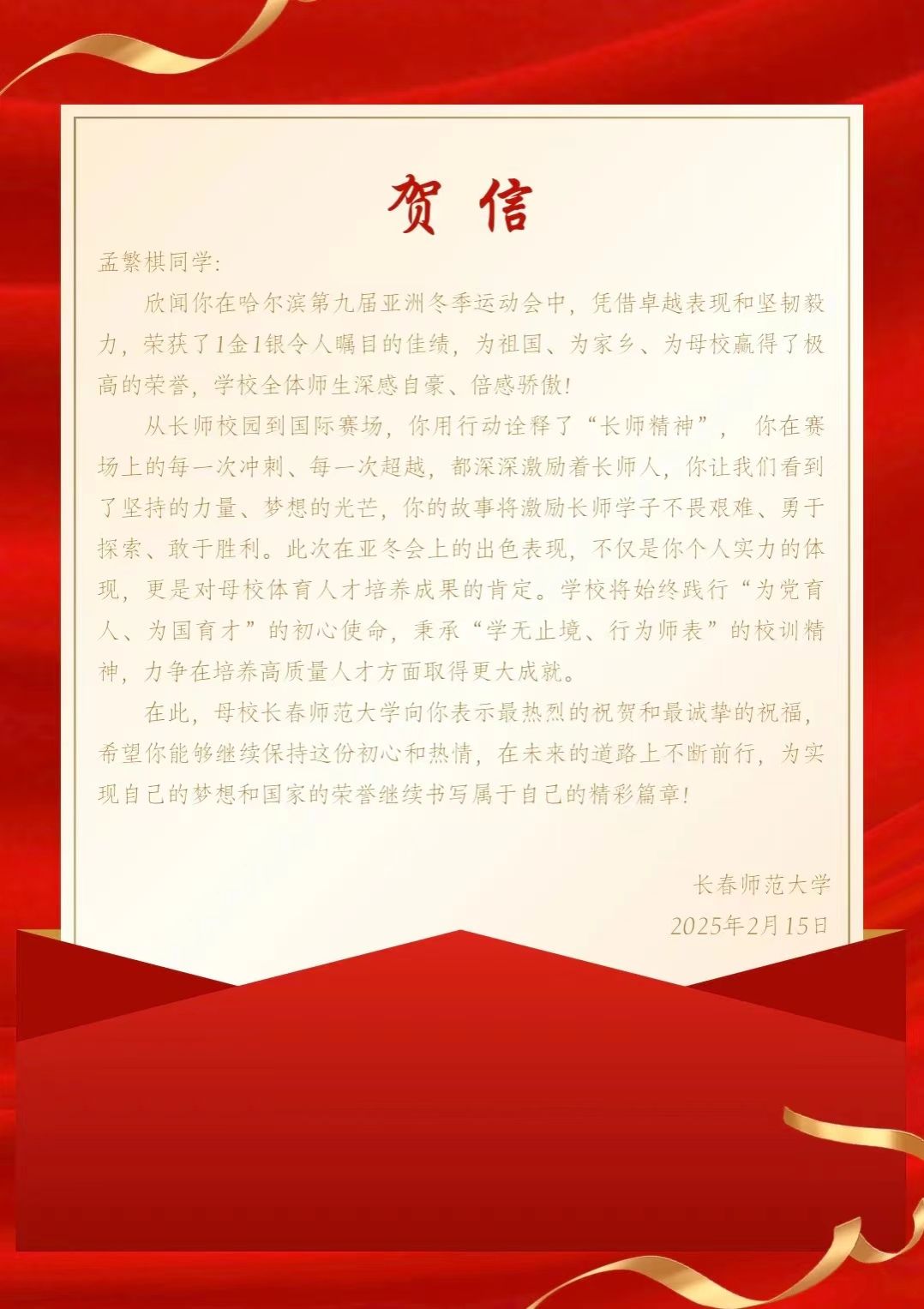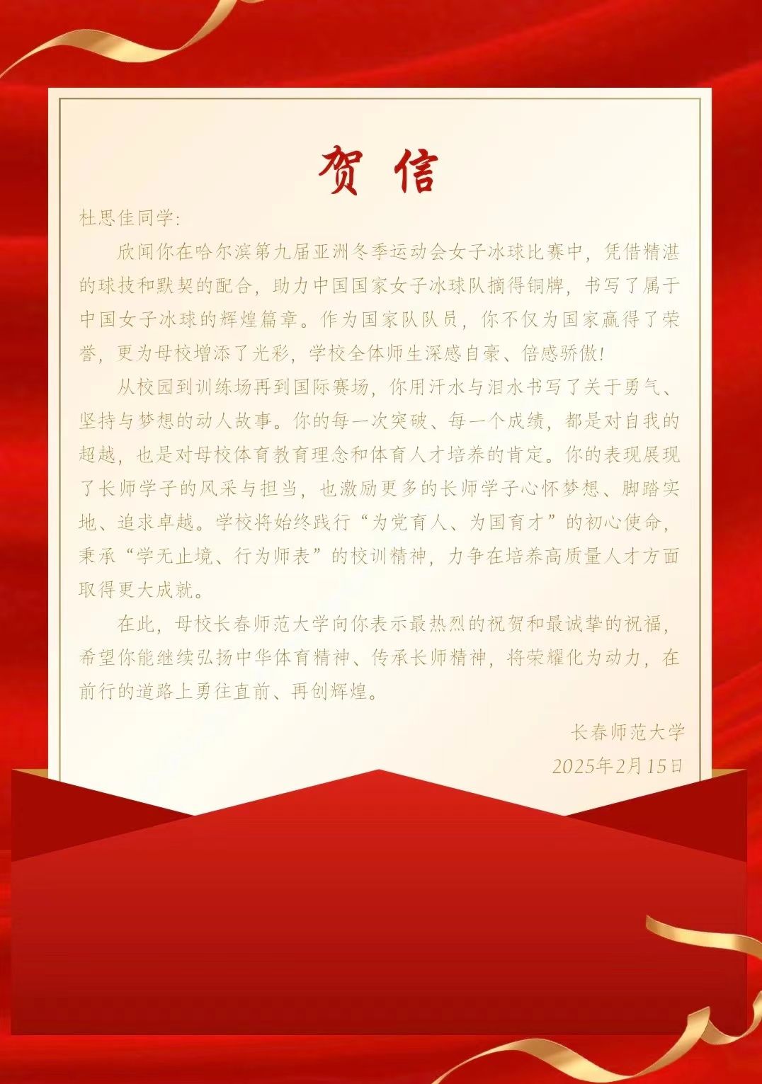 3名优秀的长师学子在亚冬会上为祖国、为家乡、为母校赢得了荣誉,学校全体师生为她们所取得的成就深感骄傲、倍感自豪,第一时间向们发去贺信,表达最热烈的祝贺和最诚挚的祝福!